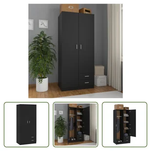 Szafa czarna 80x52x180 cm materiał drewnopochodnyUbrania i akcesoria będą łatwo dostępne w tej kompaktowej szafie. Oferuje ona doskonałe rozwiązanie do przechowywania i dodaje szyku Twojemu domowi. Szafa wykonana jest z wysokiej jakości drewna, które zapewnia solidność, trwałość i długą żywotność. Posiada 2 szuflady, dużą komorę z drążkiem na wieszaki i oferuje mnóstwo miejsca zarówno na dłuższe kurtki, jak i inne ubrania lub akcesoria, takie jak swetry, dżinsy, czapki, torebki itp. Produkt jest łatwy w czyszczeniu.