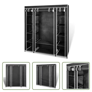 Ta przenośna składana szafa chroni ubrania i buty przed kurzem i brudem w piwnicy, pokoju dziecięcym, sypialni, na strychu lub podczas biwakowania. Ta materiałowa szafa jest wyposażona w różne przegródki i drążki. Zwijane drzwi można łatwo otwierać i zamykać za pomocą rzepów i zamków błyskawicznych. Składana szafa wykonana jest z wytrzymałej włókniny i odpornych na wilgoć żelaznych prętów. Dzięki temu jest trwała, zajmuje niewiele miejsca i jest łatwa w montażu.