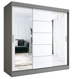Model - niebanalne wnętrze, doskonała prezencja, praktycznie i bez wad! Harmonia funkcjonalności i minimalistycznego piękna Trzydrzwiowa szafa przesuwna emanuje subtelnością i praktycznym pięknem. Wykonana z wysokogatunkowej 16 mm laminowanej płyty meblowej, dostępnej w 14 kolorach, z łatwością wpisze się w estetyczny kilmat Twojego wnętrza. Szafa charakteryzuje się dwoma lustrzanymi frontami, które rozjaśniają pomieszczenie i optycznie je powiększają. Środkowe drzwi ozdobione szprosami wiedeńskimi w kolorze srebrnym podkreślają modernistyczny design mebla. Praktyczny wymiar szaty to zasługa precyzyjnie zaplanowanego wnętrza z 4 półkami i 4 drążkami w 6 opcjach konfiguracyjnych.