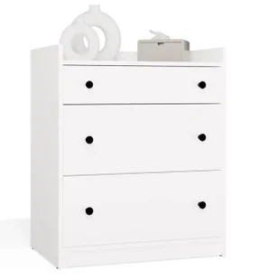 pod przewijak. Stylowe, czarne uchwyty – metalowe, trwałe i wygodne w codziennym użytkowaniu. Prosty, uniwersalny design – pasuje do różnych stylów wnętrz: skandynawskich, klasycznych, nowoczesnych. Reprezentantka wysokiej jakości Płyta laminowana z powłoką melaminową, o gęstości do 800 kg/m³, zapewniająca wyjątkową odporność na uszkodzenia mechaniczne oraz odporność na wilgoć i czynniki chemiczne.