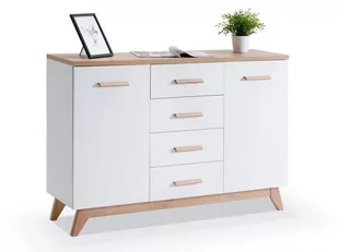 cechy z półkami zamkniętymi, z szufladami, prowadnice kulkowe Kolorystyka kolor frontów: biały, dąb naturalny kolor główny: biały kolor korpusu - stelaża: biały, dąb naturalny kolor nóżek: dąb naturalny przeznaczenie biuro, lokal usługowy, pokój dziecka, pracowania w domu, przedpokój, salon styl wnętrzarski skandynawski Wymiary i waga długość: