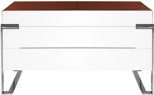 Elegancka komoda z białym frontem na wysoki połysk wykonana z połączonych materiałów, drewna i stali. Dwie pojemne szuflady pomieszczą wszystkie potrzebne przedmioty. Dodatkowym atutem jest rozsuwany blat pod którym kryją się przegrody na drobiazgi. Szafka doskonale spełni swoją funkcję zarówno w sypialni, jak i salonie. Mebel nie wymaga samodzielnego montażu, jest dostarczany w całości.