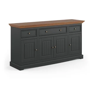 Korpus i fronty zabezpieczono emalią wodną w kolorze grafitowym o stopniu krycia 90%. Mimo to, możesz dostrzec i wyczuć naturalną strukturę drewna. Wyjątkowy blat i górny wieniec w kolorze dębowym, pokryto bejcą wodną i lakierem. Transparentne wybarwienie podkreśla naturalne usłojenie drewna. Komoda prowansalska grafitowa Belluno Elegante stworzy doskonały duet z witryną lub mniejszą komodą.