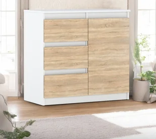 Komoda biała drewniana nowoczesna do sypialni 80cm 3 szuflady dąb sonoma