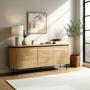 Komoda Beck w dębowym wykończeniu łączy funkcjonalność z nowoczesnym stylem. Posiada 4 półki, bezuchwytowe fronty „push to open” i mechanizm cichego domyku. Czarne metalowe nóżki i ryflowane boki dodają elegancji. Idealna do nowoczesnych, skandynawskich wnętrz.