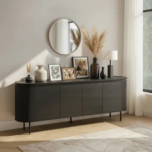 Komoda czterodrzwiowa BECK w kolorze czarnym to styl i funkcjonalność w jednym. Elegancka, ryflowana forma, system „push to open”, cichy domyk i pojemne wnętrze ułatwią organizację. Stabilna, solidna, nowoczesna - idealna do salonu, sypialni czy biura.