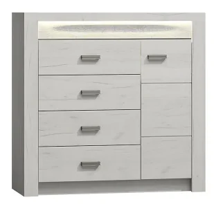 Tak wykonana komoda to kwintesencja ponadczasowej jakości i zawsze modnego funkcjonalizmu. Postaw ten wyjątkowy mebel w swoim wnętrzu i przekonaj się jak wszystko się świetnie układa! Dlaczego komoda ? Praktyczne i wygodne drzwi osadzone na trwałych zawiasach puszkowych, regulowanych w 3 płaszczyznach. Odpowiednio zorganizowana przestrzeń do przechowywania z 4 głębokimi szufladami i pojemną szafką do przechowywania. Stylowe metalowe uchwyty i ozdobny detal w postaci subtelnie ryflowanej deski. Brzegi mebla oklejone specjalistycznym tworzywem ABS o zwiększonej odporności na ścieranie i wilgoć.