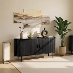 Komoda Trish w czerni to połączenie prostoty i loftowego stylu. Matowe wykończenie i ryflowane fronty dodają jej elegancji, a rozsuwane drzwi oszczędzają miejsce. Dwie półki, cztery wnęki i boczne schowki zapewniają funkcjonalność, a subtelne, metalowe nóżki dodają lekkości.