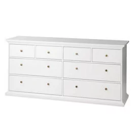 Romantyczna biała komoda PARIS 4+4 to idealne uzupełnienie pomieszczenia urządzonego w gustownym, lekkim stylu. Spełnia nie tylko praktyczne funkcje, jako pojemny schowek na różnego rodzaju przedmioty, ale także stanowi stylową, elegancką ozdobę jadalni, salonu, sypialni itd. Romantyczna, delikatna i subtelna, dekorowana pięknymi uchwytami, które nadają jej szczególnego charakteru. To świetny pomysł na dopełnienie wnętrza urządzonego elegancko i ze smakiem. Biały kolor nadaje lekkości i subtelności.