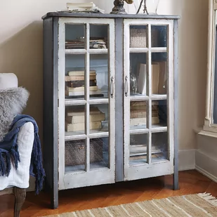 Ta mała, ale finezyjna komoda to wyjątkowo elegancki dodatek, który przyciąga wzrok. Drewniana rama jest malowana, podobnie jak drzwi i wnętrze. Wysokiej jakości antyczny laserunek został ręcznie nałożony i nosi ślady użytkowania, dzięki czemu każdy egzemplarz jest naprawdę wyjątkowy. Jednocześnie metalowe uchwyty dwojga szklanych drzwi podkreślają naturalność mebla. Niezwykle praktycznym rozwiązaniem jest również to, że wewnątrz znajdują się trzy półki, które oferują mnóstwo miejsca na książki, dekoracje lub naczynia.