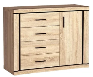 Brzegi komody zostały precyzyjnie oklejone specjalistycznym tworzywem ABS o zwiększonej odporności na ścieranie i wilgoć. Przestronne wnętrze komody zostało zorganizowane w wyjątkowo funkcjonalny sposób. Komoda została wyposażona w 4 szuflady na prowadnicach rolkowych oraz praktyczną, zamykaną szafkę z półką dzielącą przestrzeń na pół. Tak wykonana komoda marki Elior to fantastyczny pomysł na przechowywanie i niesztampową aranżację wnętrza. Idealna komoda w 5 krokach! Trwała konstrukcja z ekologicznej, laminowanej płyty meblowej.