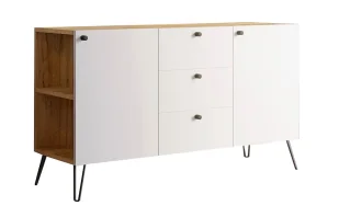 W sercu komody znajdują się trzy pojemne szuflady na prowadnicach rolkowych, które gwarantują wygodne i płynne użytkowanie. Dodatkowe otwarte, boczne półki dodają jej niepowtarzalnego uroku, jednocześnie umożliwiając ekspozycję dekoracyjnych przedmiotów. Przestrzeń według Twoich potrzeb - komoda prosty, industrialny design w połączeniu z ciepłem naturalnego drewna tworzy niezwykłą kombinację, która wpasuje się w każde wnętrze. stylowe, solidne metalowe nóżki dodają komodzie wyrazistego kontrastu i gwarantują jej stabilność. komoda jest doskonałym dodatkiem do salonu, sypialni, czy nawet biura.