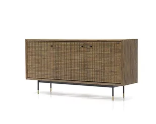 brązowyNóżki: grafitowo-złote, lakierowane Szczegóły produktu: Kredens: Styl vintageSzczotkowane drewno akacjowejedne drzwi skrzydłowe, lewejedne podwójne drzwi na zawiasachprzyciągający wzrok wzór w szachownicęMetalowe nóżkiLakierowane w kolorze grafitowego złota Materiał: Korpus i front: lite drewno akacjoweNóżki: