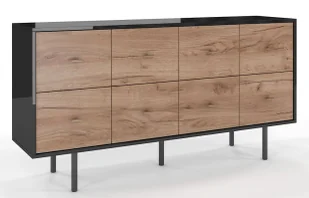 Niezwykłym dopełnieniem całości stają się czarne, proste nogi, które nadają tej wydawałoby się masywnej bryle niebywałej lekkości. Ponadczasowa stylistyka komody sprawia, że może być ona doskonałym uzupełnieniem nie tylko reprezentacyjnego salonu, ale także sypialni, przedpokoju, a nawet jadalni. to mebel dopracowany w każdym szczególe, dzięki czemu wyróżnia się nie tylko niezwykłą estetyką wykonania, ale także szeregiem innowacyjnych rozwiązań. Wyposażona została w profesjonalny system cichego domykania, dzięki czemu wystarczy lekko pchnąć front, a ten domknie się miękko i bezgłośnie sam. Skończ z aranżacyjną nudą, postaw na niebanalny szyk i stwórz aranżację o luksusowym charakterze! Niezwykła estetyka wykonania oraz najwyższa jakość materiałów Nowoczesna komoda poza niezwykłą stylistyką wyróżnia się także wysokogatunkowymi materiałami z których została wykonana.