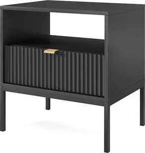 Stolik nocny NovaSzafka nocna w kolorze czarnego matu to doskonały wybór do nowoczesnej sypialni. Stolik nocny wyróżnia się na tle innych ponadczasową formą oraz podłużnymi frezowanymi frontami, które przyciągają uwagę. Szafka Nova została wyposażona w praktyczną pojemną szufladę oraz otwartą półkę pod blatem dając możliwość przechowywania akcesoriów i innych drobiazgów. Nowoczesna szafka nocna osadzona została na metalowych nóżkach. Wykonana z najwyższej jakości płyty laminowanej, która odporna jest na uszkodzenia mechaniczne.