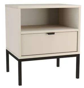 Elegancja i funkcjonalność w nowoczesnym wydaniu Praktyczna szuflada z pełnym wysuwem zapewnia łatwy dostęp do zawartości i porządek w przechowywanych drobiazgach Otwarta półka idealna na książkę, okulary czy telefon Stabilne czarne metalowe nóżki nadają szafce lekkości i nowoczesnego charakteru Ergonomiczny uchwyt ułatwiający otwieranie szuflady i podkreślający estetykę mebla Uniwersalny styl pasujący zarówno do wnętrz loftowych, jak i skandynawskich Trwałość i jakość wykonania, które widać na pierwszy rzut oka Korpus mebla wykonany z płyty laminowanej 18 mm – płyta z powłoką melaminową, o gęstości do 800 kg/m³, zapewniająca wyjątkową odporność na uszkodzenia mechaniczne oraz odporność na wilgoć i czynniki chemiczne. Precyzyjne prowadnice kulkowe o wzmocnionej konstrukcji, umożliwiające ciche i płynne użytkowanie z pełnym wysuwem. Obrzeża wykonane z tworzywa ABS o wysokiej trwałości (twardość 70-80 Shore D) odporne na odkształcenia, uszkodzenia mechaniczne. Nogi – wysokogatunkowy metal, zabezpieczony specjalistyczną warstwą ochronną z dodatkowym systemem pigmentów antykorozyjnych. Wymiary szafki: