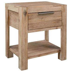 Stolik nocny skonstruowano z litego drewna akacjowego, co czyni go bardzo trwałym i wytrzymałym. Szczotkowane wykończenie nadaje mu autentyczny, postarzony wygląd retro, który wprowadzi nieco tradycyjnej stylistyki do Twojego domu. Mocny blat jest idealnym miejscem na budzik, lampkę, książki itp., a także do ustawienia ramek ze zdjęciami lub innych dekoracji. Szuflada i półka zapewniają przestrzeń do przechowywania różnych drobnych przedmiotów w uporządkowany sposób i w zasięgu ręki. Produkt jest już złożony, więc montaż nie jest wymagany.