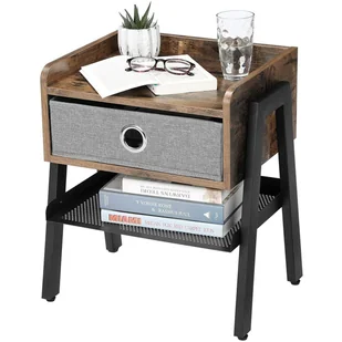 Stolik, szafka nocna z szufladą , 46x35x52 cm, ciemny brąz, czarny, mat. Elegancja w stylu vintage . Wysokiej jakości połączenie metalu z płytą wiórową zapewni trwałość na lata . Wyjmowana szuflada tekstylna oraz metalowa półka gwarantują dużo miejsca na książki czy różne drobiazgi. Kwiaty, ozdoby czy lampkę nocną ustawisz na wytrzymałym blacie – ładowność do 10kg .