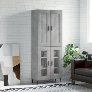 Kolor: szarość betonu Materiał: materiał drewnopochodny, żelazo, szkło Wymiary całkowite: 69,5 x 34 x 180 cm (szer. x gł. x wys.) Wymiary kredensu: 69,5 x 34 x 90 cm (szer. x gł. x wys.) Wymiary nadstawki: 69,5 x 34 x 90 cm (szer. x gł. x wys.) Wymagany montaż: