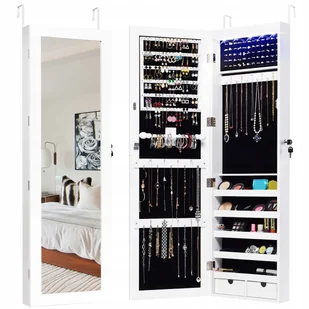 Szafka ma również zamek z boku, aby zabezpieczyć cenne przedmioty, aby nikt inny nie miał do nich dostępu. Szafkę na biżuterię można zawiesić na ścianie lub nad drzwiami, aby zwolnić więcej miejsca na podłodze, co jest idealnym rozwiązaniem zarówno w przypadku ograniczonej przestrzeni, jak i dużych pomieszczeń. Cechy: Lustro o pełnej długości zapewnia widok stroju od stóp do głów. Światła LED pięknie oświetlają biżuterię i ułatwiają jej wybór w ciemnościPrzechowuje kolczyki, bransoletki, pierścionki, naszyjniki, lakiery do paznokci i palety do makijażu6 wyłożonych tacek na kolczyki i kolczyki sztyftyNadaje się do 60 miejsc na pierścionki29 haczyków do zawieszania krótkich lub długich naszyjników z zawieszkami1 drążek do umieszczania szalików i bransoletek5 półek do przechowywania zegarków, okularów przeciwsłonecznych, lakierów do paznokci, perfum, kosmetyków do makijażu i szminek2 dolne szuflady na kosztownościWewnętrzna wyściółka doskonale chroni ukochaną biżuterię przed zarysowaniamiWykonany z mocnych płyt MDF z matowym białym wykończeniem zapewniającym długotrwałą trwałośćMożna zawiesić na ścianie lub nad drzwiami, aby zwolnić więcej miejsca na podłodzeBiałe listwy pięknie komponują się na ścianie lub nad drzwiamiZamykane drzwiczki z zapasowym kluczem do zabezpieczenia kosztownościDane techniczne: Kolor: białyMateriał:
