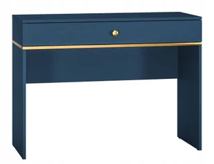 Polskiej produkcji toaletka BLU z szufladą Toaletka BLU to niezbędny element wyposażenia kobiecej sypialni, idealny dla każdej kobiety pragnącej mieć wygodne miejsce do makijażu, czesania i dbania o urodę. Nowoczesna toaletka stanowi część eleganckiej i praktycznej kolekcji mebli polskiej produkcji, przeznaczonych do wyposażenia salonu i sypialni. Mebel wykonany jest z wysokiej jakości płyty laminowanej w modnym granatowym kolorze, co nadaje mu nowoczesny wygląd. Złote dodatki, takie jak gałka szuflady oraz listwa oddzielająca szufladę od podstawy, w połączeniu z granatową kolorystyką tworzą piękną kompozycję, która doskonale pasuje zarówno do wnętrz w stylu glamour, jak i nowoczesnych. Toaletka BLU wyposażona jest w szufladę ze wzmocnionym dnem, zamontowaną na prowadnicach z pełnym wysuwem, co zapewnia komfort i wygodę użytkowania.