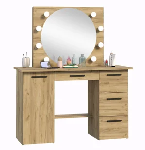 Te wszystkie rozwiązania zadowolą nawet najbardziej wymagające użytkowniczki. Toaletka od Elior oferuje wiele zalet, które czynią ją idealnym wyborem dla każdego, kto ceni sobie zarówno funkcjonalność, jak i styl: cztery duże szuflady i zamykana szafka z dodatkową półką oferują mnóstwo miejsca do organizacji kosmetyków, biżuterii i innych osobistych akcesoriów. oświetlenie składające się z 8 żarówek LED o neutralnej białej barwie zapewnia doskonałe warunki do makijażu, podkreślając naturalne kolory skóry. eleganckie, okrągłe lustro z możliwością zawieszenia na ścianie dodaje nowoczesnego charakteru, idealnego do różnych stylów wnętrz.