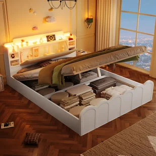 Wielofunkcyjne przechowywanie: Zagłówek oferuje nie tylko wiele otwartych przegródek do przechowywania, ale także innowacyjną, składaną konstrukcję, która ułatwia przechowywanie małych przedmiotów, takich jak okulary i telefony komórkowe. To łóżko hydrauliczne charakteryzuje się unikalnym, wysokiej jakości hydraulicznym systemem przechowywania i dużą przestrzenią pod spodem. Łatwa regulacja wysokości za pomocą kabla zapewnia wszechstronne możliwości przechowywania. Wygodne porty ładowania: Dzięki strategicznie rozmieszczonym portom USB i Type-C możesz ładować urządzenia mobilne i inne gadżety w dowolnym momencie, co pozwala cieszyć się technologią bezpośrednio w łóżku. Oszałamiająca taśma świetlna LED: Kolorowa taśma świetlna LED umożliwia łatwe przełączanie między różnymi trybami, sterowanymi dotykiem lub za pomocą aplikacji. Tworzy romantyczną lub przytulną atmosferę i natychmiast dodaje odrobinę elegancji do Twojej sypialni. Wygodnie wyściełany zagłówek: Hojnie wyściełany zagłówek zapewnia optymalny komfort i doskonałą elastyczność. Skutecznie podpiera szyję i plecy, umożliwiając wygodne odchylenie się do tyłu. Sprzyja snu i relaksowi, zapewniając absolutny komfort w sypialni. Ciepły design: Stolik nocny posiada zintegrowaną półkę na lampkę ozdobioną ładnymi elementami dekoracyjnymi, a jego podstawa jest ozdobiona motywem chmurek. W nieskazitelnej bieli emanuje miękkim i świeżym stylem, który idealnie uzupełnia radosną atmosferę dziecięcego pokoju.