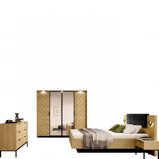 Tak, w komplecie; Ilość pojemników na pościel: 1; Rodzaj obicia: Tkanina; Stan: Nowy; Zawartość zestawu: 1x szafa 220, 1x komoda 6S, 1x łóżko 160 x 200 z pojemnikiem i oświetleniem, 2x szafka nocna, 1x stelaż metalowy z podnośnikiem materaca; Liczba szuflad: