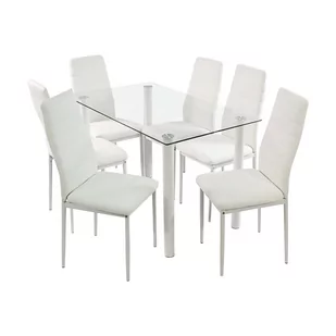 Prostokątny Kolor korpusu stołu: biały Kolor blatu stołu: przezroczysty Ilość krzeseł w zestawie: 6 Max ilość w paczce: 1 Montaż: Meble do samodzielnego montażu