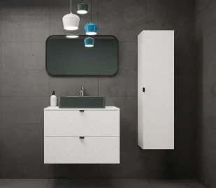 Komplet ten ten, to szafka pod umywalkę o szerokości 80 cm i słupek do przechowywania, które perfekcyjnie wpiszą się w przestrzenne wymagania większości łazienek, a ich unikatowa cecha - fronty ozdobione eleganckim wzorem angielskiej jodełki - nadadzą wnętrzu niepowtarzalny charakter. Upragniona elegancja w Twojej łazience - komplet mebli łazienkowych Szafka pod umywalkę idealna również do organizacji przestrzeni i przechowywania różnorodnych akcesoriów łazienkowych dzięki 2 pojemnym szufladom. Szuflady wyposażone w cichy domyk. Stylowy zamykany słupek łazienkowy doskonały do przechowywania. Eleganckie metalowe uchwyty ułatwiające zamykanie i stanowiące luksusowe wykończenie szafek.