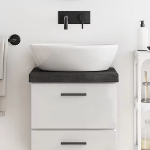 - Wytrzymała konstrukcja: blat łazienkowy wykonano z litego drewna dębowego, czyli pięknego, naturalnego materiału. Drewno to ma odcień średniego brązu oraz zwartą strukturę słojów, co przyczynia się do jego unikatowego wyglądu.