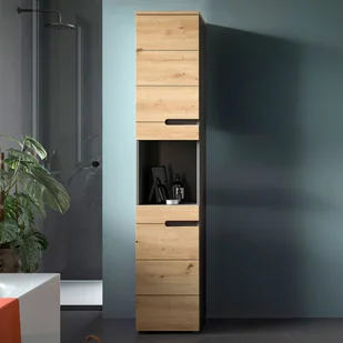 Canu wysoka szafka łazienkowa 2 drzwi, 1 półka dąb dekor, szary. Drzwi odwracalne. Drzwi Softclose. Ta wysoka szafka (szer./wys./gł.: 38 x 193 x 34 cm) zachwyca nowoczesnym połączeniem materiałów: drewnianym wykończeniem w stylu Artisan i eleganckim, czarnym wnętrzem.