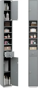 Elegancki styl i proste połączenieTa wąska szafka łazienkowa została zaprojektowana w prostym, ale eleganckim stylu i z łatwością dopasuje się do istniejącego wystroju. Nadaje się do łazienek, salonów, kuchni itp. Podwyższona podstawa chroni szafkę przed wodą. Opis: Ta wysoka szafka łazienkowa to świetne rozwiązanie do przechowywania w małych przestrzeniach! Ta szafka ma niewielką powierzchnię, ale dużą pojemność z 2 szafkami, 5 półkami i 1 szufladą, dzięki czemu idealnie nadaje się do małych przestrzeni lub narożników w domu, aby stworzyć dodatkową przestrzeń do przechowywania. Ponadto szafka posiada 5 regulowanych półek, dzięki czemu można dostosować przestrzeń do różnych potrzeb.