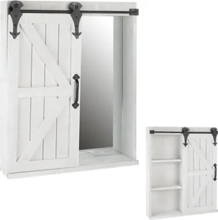 3 półkiPo prawej: 1 lustro + 1 półkaMateriał: drewno i metalKolor: BiałyWygląd: Shabby / rustykalnyRuchome drzwi przesuwne z metalowym uchwytem w kolorze czarnymW zestawie dwa metalowe wieszaki z tyłu ułatwiające montażBrązowa szafka w stylu vintage wniesie odrobinę elegancji do Twojego domuWielofunkcyjność: