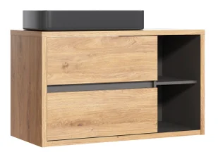 Dzięki temu, że posiada dwie pojemne szuflady pozwoli Ci przejrzyście uporządkować wszystkie kosmetyki. Dwie odkryte półki mogą posłużyć do wyeksponowania miękkich, pięknie złożonych ręczników, co wprowadzi do aranżacji duszę. Profesjonalny system cichego domykania w który zostały wyposażone szuflady znacznie podniesie komfort użytkowania mebla. Całość dzięki podwieszanej formie nie przytłoczy aranżacji, a dodatkowo ułatwi utrzymanie czystości we wnętrzu. Drewniany dekor w połączeniu z grafitem świetnie wkomponuje się w różnego rodzaju aranżacje nadając im zdecydowanego i szlachetnego charakteru.