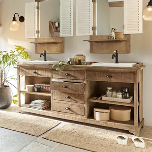 Osoby, które nie przepadają za nowoczesnym minimalizmem, prędzej czy później zakochają się w stylu rustykalnym. Styl ten łączy szlachetne, naturalne materiały z autentycznym wzornictwem minionych epok, kiedy każdy mebel był starannie wykonany ręcznie, a pomieszczenia urządzano z wielką dbałością o szczegóły. Nie pomijano tutaj także łazienki, która – zwłaszcza we francuskich domach wiejskich – była nie mniej przytulna niż strefa dzienna. Ta szafka z umywalkami w przeszłości mogła być centralnym elementem wystroju eleganckiej łazienki, ale dziś przyciąga wzrok również w nowoczesnej aranżacji i doskonale komponuje się z akcesoriami z ciemnego żelaza. Szafkę wykonano ze szlachetnego drewna mango, którego charakterystyczna nieregularna struktura tworzy na jej powierzchni żywą grę naturalnych odcieni.