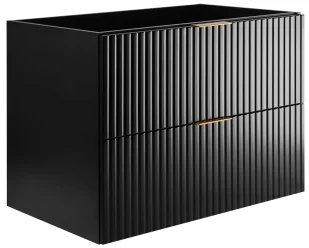 Brak blatu umożliwia dowolny wybór umywalki – to Ty decydujesz o finalnym wyglądzie mebla. Zawieszona na ścianie szafka unosi się lekko nad podłogą, dzięki czemu prezentuje się lekko i nie przytłacza nawet mniejszej łazienki. Detale, które robią różnicę w codziennym użytkowaniu Ozdobny, ryflowany front, który wprowadza strukturę i elegancję Dwie szerokie i pojemne szuflady z praktycznym wnętrzem w szarym kolorze System cichego domyku zapewniający bezgłośną, płynną pracę szuflad Możliwość wyboru spośród trzech kolorów uchwytów (złoty, srebrny, czarny) – indywidualna personalizacja bez dodatkowych kosztów Konstrukcja bez blatu – swoboda w doborze umywalki nablatowej lub wpuszczanej Materiały, które gwarantują trwałość i estetykę Fronty wykonane z frezowanej płyty MDF 16 mm zapewniają trwałość i dekoracyjny wygląd. Ryflowana powierzchnia dodaje głębi i elegancji. Korpus z laminowanej płyty meblowej 16 mm odporny na wilgoć i codzienne użytkowanie, doskonale sprawdza się w warunkach łazienkowych.