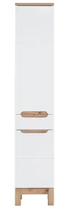 Perfekcyjnie połączona biel w połysku oraz drewniany dekor w kolorze dębu wotan doskonale wpisuje się w aktualne trendy wnętrzarskie i świetnie uzupełnia aranżacje w stylu skandynawskim, nowoczesnym lub minimalistycznym. Delikatne frezy wykonane na meblach niwelują wrażenie "płaskiej" całości dodając meblom charakteru, a brak standardowych uchwytów sprawia, że całość jest lekka wizualnie. Kolekcja mebli łazienkowych to meble ponadczasowe, które sprawią, że nikt nie przejdzie obok Twojej łazienki obojętnie! Wybierz szlachetną elegancję i stwórz niezwykłą łazienkę w Twoim mieszkaniu! Zastanawiasz się w jaki sposób dobrze zagospodarować przestrzeń łazienkową? Wciąż brakuje Ci miejsca do przechowywania, a nie chcesz przytłaczać wnętrza dużą ilością szafek i półeczek? Mamy coś idealnego. Słupek łazienkowy to mebel o doskonałych cechach. Smukły, wysoki i niesamowicie pojemny! Posiada aż 5 półek oraz jedną szufladę - dzięki czemu uporządkujesz wszystko w jednym miejscu.