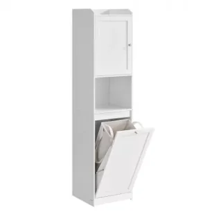 Wysoka szafka łazienkowa z koszem na pranie to funkcjonalne rozwiązanie do przechowywania. Wyposażona w górną półkę z podniesionymi krawędziami, zamkniętą przegrodę na prywatne przedmioty, otwartą półkę na codzienne akcesoria oraz kosz na pranie. Wyjmowany kosz z tkaniny, z wygodnymi uchwytami, ułatwia przenoszenie prania do pralki, a jego powłoka hydrofobowa ułatwia czyszczenie. Wzmocniona panelami trapezowymi i metalowymi zawiasami, zapewnia trwałość i stabilność. Zestaw zabezpieczający przed przewróceniem zwiększa bezpieczeństwo, umożliwiając przymocowanie szafki do ściany.