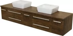 Szafka łazienkowa antyczne drewno 210cm FOKUS z blatem i dwiema umywalkami FKS-AD-U210/50/C2 + FKS-AD-B210/52/2 + 2x VENO-46/42 Nowoczesna bardzo ekskluzywna szafka łazienkowa w kolorze antycznego drewna wraz z blatem oraz dwiema białymi ceramicznymi umywalkami z serii FOKUS. Szafka posiada cztery szuflady oraz troje drzwiczek. Umywalki posiadają otwory na baterie. Szafka wyposażona jest w system cichego domykania , który sprawia, że szuflady oraz drzwiczki w ostatniej fazie zamykania zwalniają, aby niemal bezgłośnie się zamknąć. Prezentowana seria FOKUS to nowoczesny design w prostej formie.