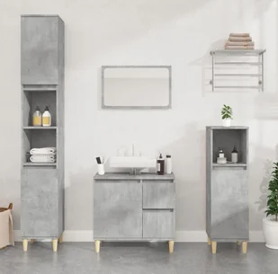 Nogi z litego drewna eukaliptusowego nadają szafce łazienkowej naturalny i przyjemny wygląd, zapewniając jednocześnie stabilność. Elastyczna konstrukcja: Drzwi można umieścić po lewej lub prawej stronie, w zależności od potrzeb. Uwaga: Aby zapobiec przewróceniu się tego produktu, należy go zabezpieczyć za pomocą dołączonego wspornika ściennego. Kolor: betonowy szaryMateriał: