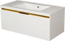 Szafka łazienkowa biała 100cm DIAMOND GOLD z umywalką i złotą lustrzaną wstawką DMDG-B-U100/48 + LUCY-1000C Szafka łazienkowa glamour z serii Damond Gold w białym, połyskowym kolorze ze złotym uchwytem krawędziowym i złotą, lustrzaną wstawką w zestawie z białą, dolomitową umywalką. Szafka posiada jedną, ale bardzo pojemną szufladę, wyposażoną w system cichego domykania , który sprawia, że szuflada w ostatniej fazie zamykania zwalnia, aby niemal bezgłośnie się zamknąć. Umywalka naszafkowa LUCY-1000C z misą o subtelnym lecz wyrazistym kształcie idealnie uzupełnienia cały zestaw. Umywalka posiada otwór na baterię. Meble łazienkowe z serii Diamond Gold marki Gante produkowane są w Polsce.