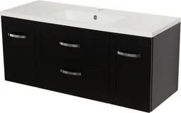 Szafka łazienkowa czarna 121cm MEIVA z umywalką MVA-C-U121/46C + MEWA-1210C Ekskluzywna szafka łazienkowa w klasycznym stylu w czarnym kolorze wraz z prostokątną białą dolomitową umywalką z serii MEIVA. Szafka posiada dwie szuflady oraz dwoje drzwiczek. Umywalka posiada otwór na baterię. Szafka wyposażona jest w system cichego domykania , który sprawia, że drzwiczki oraz szuflady w ostatniej fazie zamykania zwalniają, aby niemal bezgłośnie się zamknąć. Meiva to połączenie nowoczesności i klasycznego stylu.
