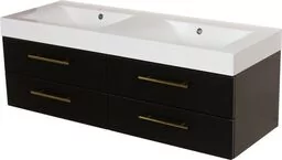 Szafka łazienkowa czarna 140cm BELLI GOLD z umywalką podwójną BEL-C-U140/50/4 + NELA-1400D Szafka łazienkowa w czarnym matowym kolorze i złotymi uchwytami wraz z podwójną, białą umywalką z serii BELLI GOLD. Umywalka posiada otwory na baterie. Szafka wyposażona jest w system cichego domykania , który sprawia, że szuflady oraz drzwiczki w ostatniej fazie zamykania zwalniają, aby niemal bezgłośnie się zamknąć. Meble łazienkowe z serii BELLI GOLD marki GANTE produkowane są w Polsce. Wysoka jakość, bogate wzornictwo, precyzja wykonania, niezwykłe i funkcjonalne rozwiązania estetyczne oraz maksymalna użyteczność to znaki szczególne tych produktów.