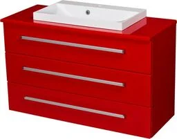 Szafka łazienkowa czerwona 100cm FOKUS z blatem i umywalką FKS-CZ-U100/39/3 + FKS-CZ-B100/41 + LIV-600C Nowoczesna, bardzo ekskluzywna szafka łazienkowa w czerwonym połyskowym kolorze wraz z blatem oraz prostokątną białą dolomitową umywalką z serii FOKUS. Szafka posiada trzy szuflady. Umywalka posiada otwór na baterię. Szafka wyposażona jest w system cichego domykania , który sprawia, że szuflady w ostatniej fazie zamykania zwalniają, aby niemal bezgłośnie się zamknąć. Prezentowana seria FOKUS to nowoczesny design w prostej formie.