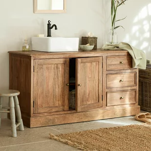Takie szafki łazienkowe można czasami spotkać we francuskich podmiejskich hotelikach, w których czas wydaje się stać w miejscu, a meble nie zmieniały swojego położenia od wieków. Ty możesz jednak wykorzystać tę niezwykłą szafkę, aby odmienić charakter swojej łazienki, która być może – jak w wielu domach – do tej pory pełniła jedynie rolę funkcjonalną. Ciemne drewno, klasyczne kasetonowe zdobienia i solidna podstawa wprowadzają do wystroju wnętrza klimat rustykalnej sielanki i przemieniają łazienkę w stylową oazę relaksu. Na tradycyjnej szafce łazienkowej spoczywa kanciasta umywalka nablatowa wykonana z nowoczesnej i niezwykle modnej ceramiki. W trzech pojemnych szufladach zmieszczą się ręczniki, kremy, szampony, suszarka do włosów i wiele więcej, a w Twojej łazience zawsze będzie panował przyjemny porządek.