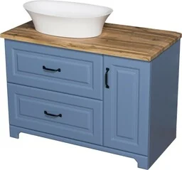 Szafka łazienkowa niebieska 100 cm FINEA z umywalką FINI 600C Szafka pod umywalkę FNA-N-U100/50/2 Szafka łazienkowa szerokości 102 cm z serii Finea w niebieskim / błękitnym kolorze w połączeniu z blatem w kolorze dębu naturalnego. Szafka posiada dwie szuflady oraz drzwiczki, z którymi znajdziemy dwie półki. Szafka wyposażona jest w system cichego domykania , który sprawia, że drzwiczki oraz szuflady w ostatniej fazie zamykania zwalniają, aby niemal bezgłośnie się zamknąć. Fronty szafki oraz dolny cokół zdobią klasyczne frezy, które w ostatnim czasie znowu podbijają rynek meblarski. Uchwyty meblowe również zostały dobrane tak, aby pasowały stylistycznie do zdobień .