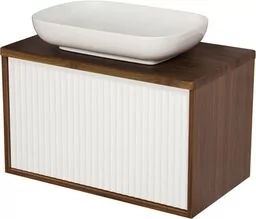 Szafka łazienkowa orzech 80cm VENUS z blatem i umywalką VEN-W-U80/48/2 + PREMIUM 60 Elegancka i innowacyjna szafka łazienkowa w kolorze orzech wraz z blatem oraz białą ceramiczną umywalką z serii Venus. Biała struktura frontu została ozdobiona wzorem 3D imitującym pionowe panele, które sprawiły, że szafka prezentuje się nieszablonowo i stylowo. Przemyślane połączenie kolorystyczne świetnie sprawdzi się w nowoczesnych wnętrzach, tworząc w nich niezwykle ciepły i niepowtarzalny klimat. Standardowy system otwierania w tej szafce został zastąpiony nowoczesnym push to open , dzięki czemu front jak i cała bryła szafki z każdej strony prezentuje czystą i nienaganna powierzchnię. Wysoka jakość i komfort użytkowania Za frontem szafki skryta jest dodatkowo jeszcze jedna wewnętrzna szuflada.