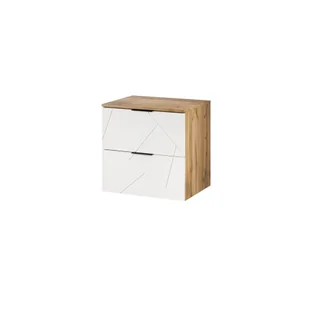 Szafka łazienkowa pod umywalkę szynaka meble mazi 60 cm wotan/biały mat th-100-1814 to nowoczesny mebel do łazienki, który wyróżnia się unikalnym i ryflowanym frontem. Geometryczny wzór zaprezentowany na białej powierzchni szuflad kontrastuje z korpusem w ciepłym odcieniu drewna, tworząc ciekawą kompozycję. Model z częściowym wysuwem występuje w komplecie z czarnymi uchwytami. Oryginalna szafka podumywalkowa wykonana została z płyty laminowanej oraz płyty mdf ryflowanej, wykazując właściwości o