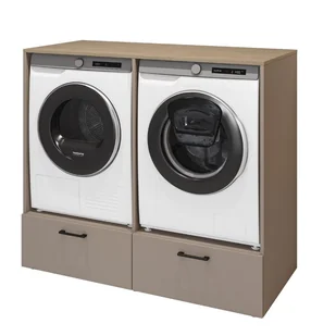 Szafka oferuje dwa miejsca na sprzęt AGD, umieszczone na ergonomicznej wysokości, co znacznie ułatwia codzienne prace związane z praniem. Pod urządzeniami znajdują się dwie pojemne szuflady na rolkowych prowadnicach – idealne do przechowywania detergentów, kapsułek, ściereczek czy innych akcesoriów. Każda z nich wytrzymuje obciążenie do 5 kg. Dodatkowym atutem mebla jest szeroki blat w dekorze dębowym, który nie tylko dopełnia elegancki wygląd, ale pełni również funkcję praktycznej powierzchni roboczej – świetnie sprawdzi się jako miejsce na kosz z praniem, do składania ubrań lub przechowywania najczęściej używanych produktów.